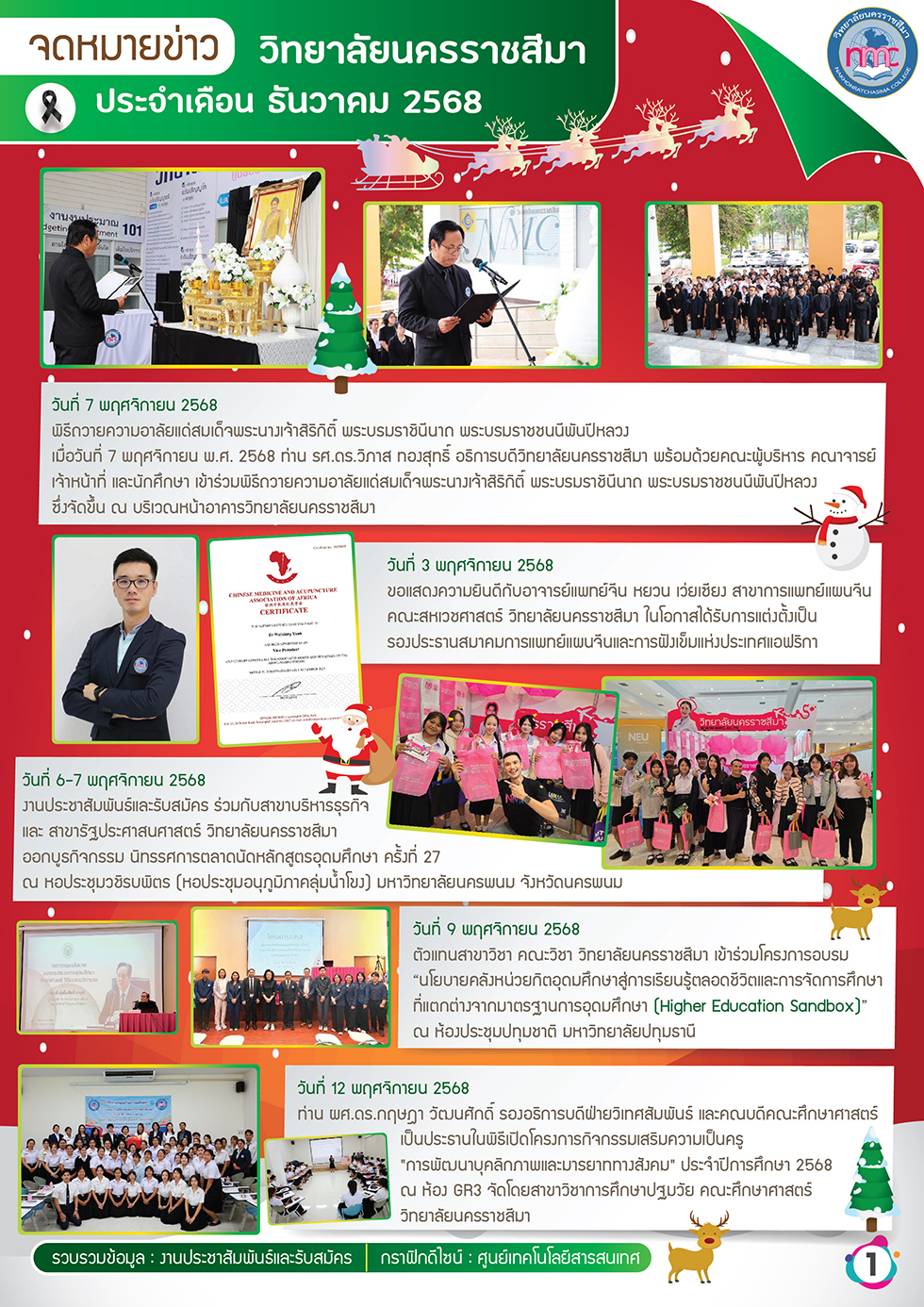 ๕ ธันวาคม วันชาติและวันพ่อแห่งชาติ ประจำปีการศึกษา ๒๕๖๘ วันพฤหัสบดีที่ ๔ ธันวาคม พ.ศ. ๒๕๖๘ สำนักพัฒนานักศึกษาและศิลปวัฒนธรรม จัดโครงการ ๕ ธันวาคม วันชาติและวันพ่อแห่งชาติ โดยมีท่าน รองศาสตราจารย์ ดร.วิภาส ทองสุทธิ์ อธิการบดีวิทยาลัยนครราชสีมา เป็นประธานในพิธี โดยภายในงานเริ่มด้วยพิธีกล่าวน้อมรำลึกในพร |