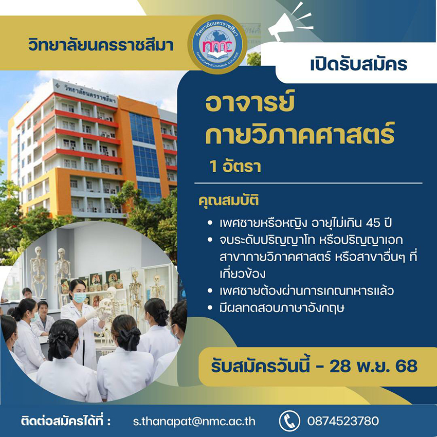 หัวข้อ : ประกาศรับสมัครอาจารย์ประจำหมวดวิทยาศาสตร์พื้นฐานและปรีคลินิก สำนักวิทยาศาสตร์และศึกษาทั่วไป ตำแหน่งอาจารย์ กายวิภาคศาสตร์ จำนวน 1 อัตรา เปิดรับสมัครตั้งแต่วันนี้ - 28 พ.ย. 2568