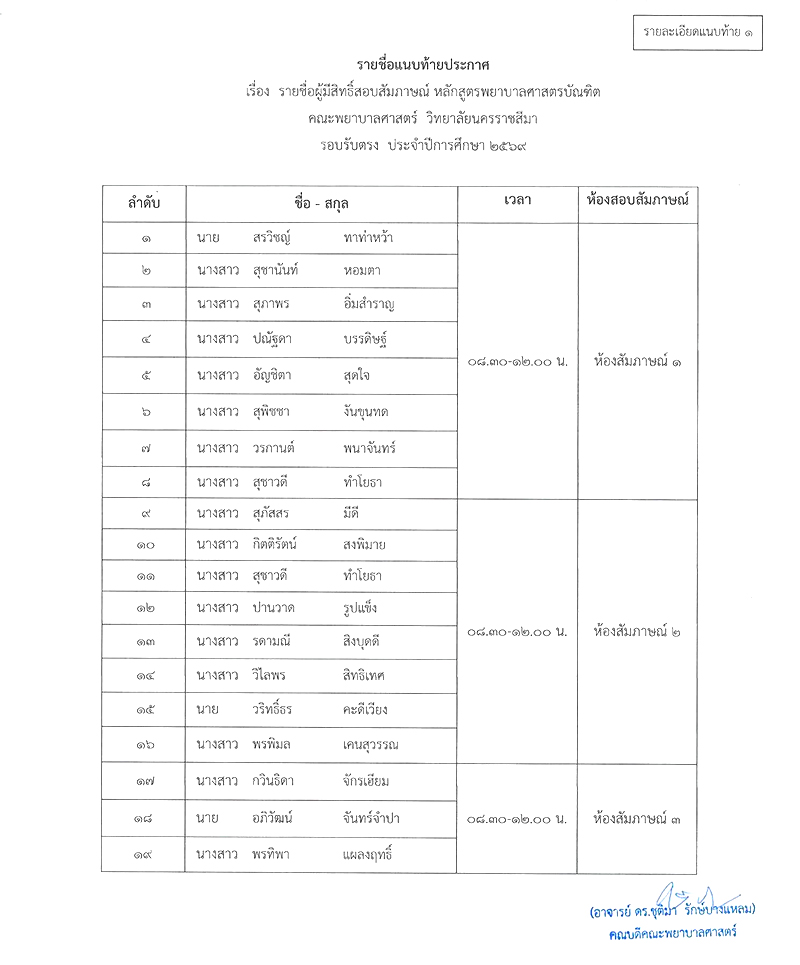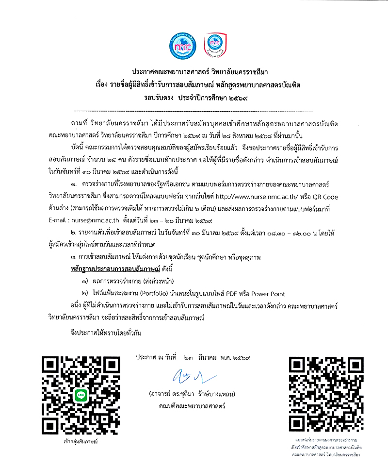 : ประกาศรายชื่อผู้มีสิทธิ์เข้ารับการสัมภาษณ์ หลักสูตรพยาบาลศาสตรบัณฑิต คณะพยาบาลศาสตร์ ปีการศึกษา 2569 ( รับตรงรอบ 2)