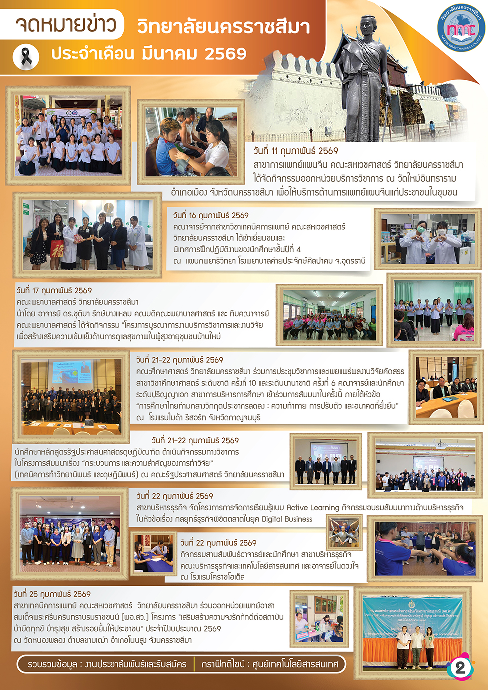 วันที่ 25 กุมภาพันธ์ 2569 สาขาเทคนิคการแพทย์ คณะสหเวชศาสตร์ วิทยาลัยนครราชสีมา ร่วมออกหน่วยแพทย์อาสาสมเด็จพระศรีนครินทราบรมราชชนนี (พอ.สว.) โครงการ "เสริมสร้างความจงรักกักดีต่อสถาบัน บำบัดทุกข์ บำรุงสุข สร้างรอยยิ้มให้ประชาชน" ประจำปีงบประมาณ 2569 ณ ว