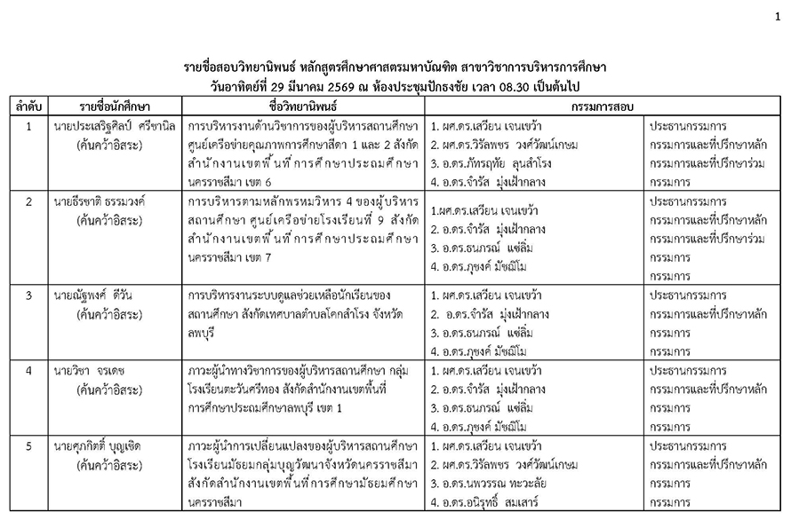 หัวข้อ : ประกาศรายชื่อสอบวิทยานิพนธ์ หลักสูตรศึกษาศาสตรมหาบัณฑิต สาชาวิชาการบริหารการศึกษา วันอาทิตย์ที่ 29 มีนาคม 2569 ณ ห้องประชุมปักธงชัย