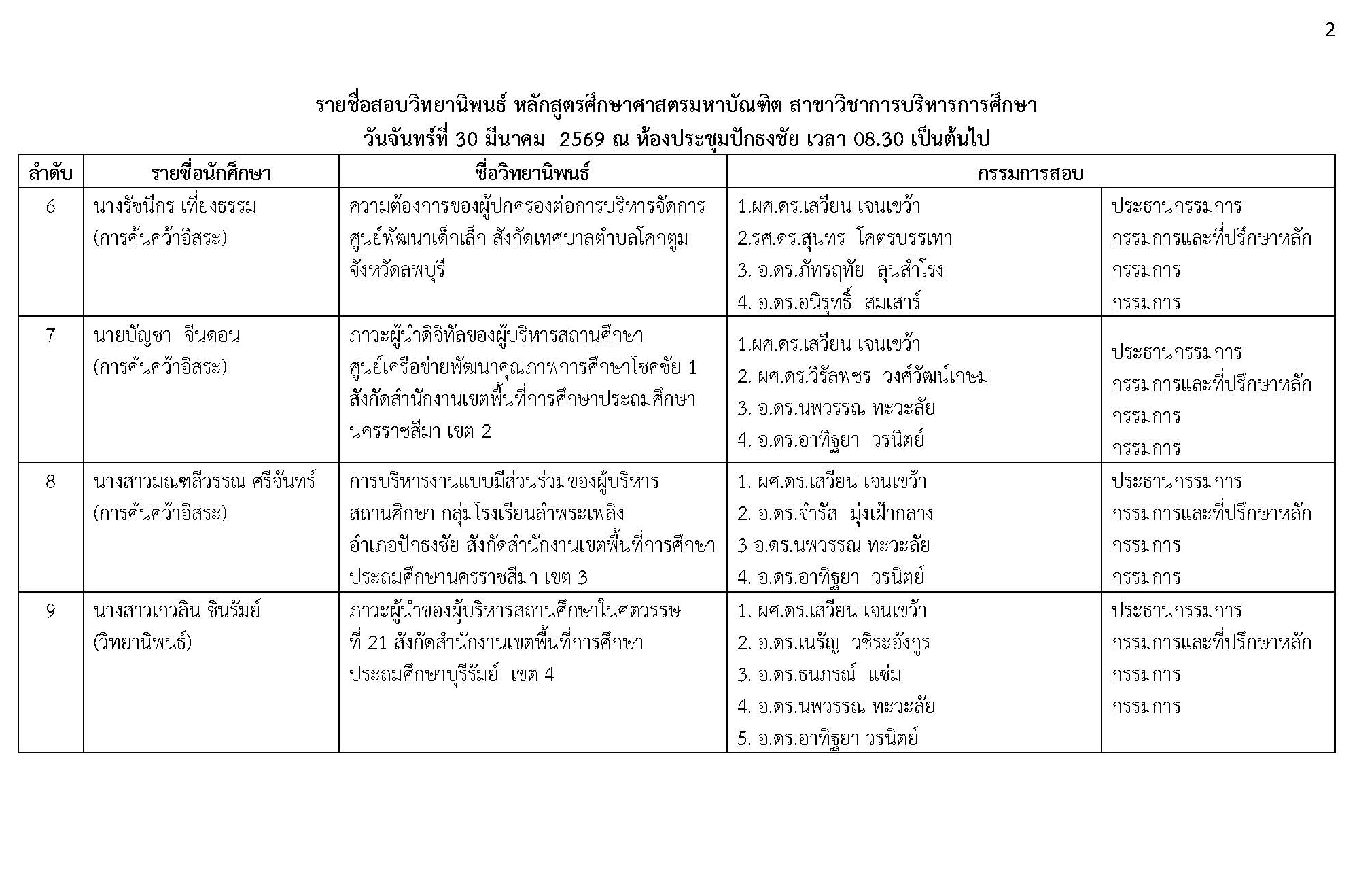 หัวข้อ : ประกาศรายชื่อสอบวิทยานิพนธ์ หลักสูตรศึกษาศาสตรมหาบัณฑิต สาชาวิชาการบริหารการศึกษา วันจันทร์ที่ 30 มีนาคม 2569 ณ ห้องประชุมปักธงชัย
