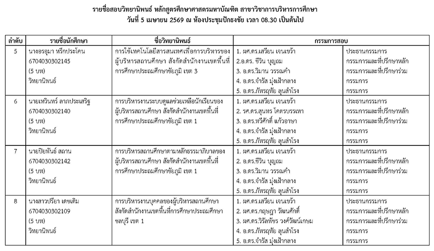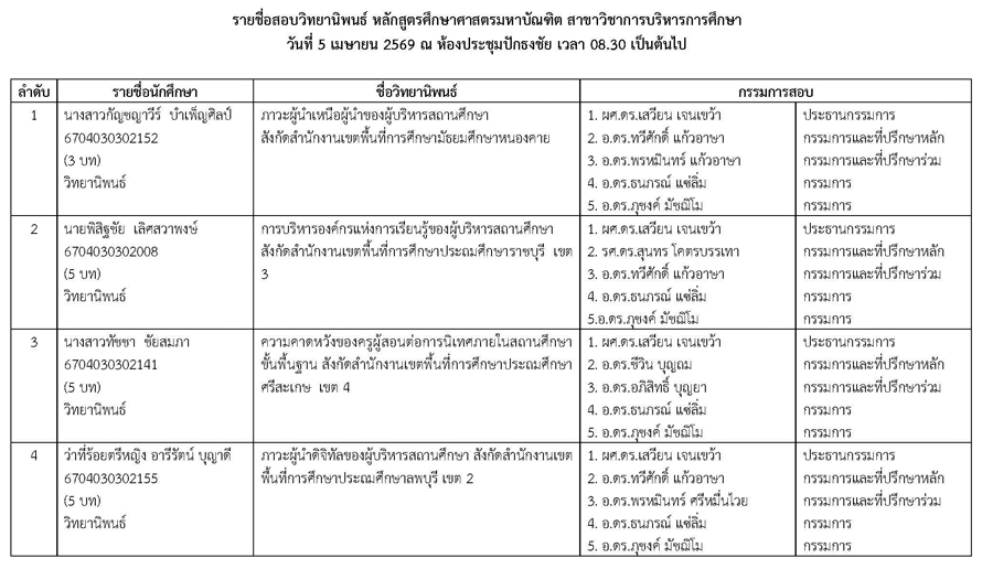 หัวข้อ : ประกาศรายชื่อสอบวิทยานิพนธ์ หลักสูตรศึกษาศาสตรมหาบัณฑิต สาชาวิชาการบริหารการศึกษา วันอาทิตย์ที่ 5 เมษายน 2569 ณ ห้องประชุมปักธงชัย เวลา 08.30 น. เป็นต้นไป